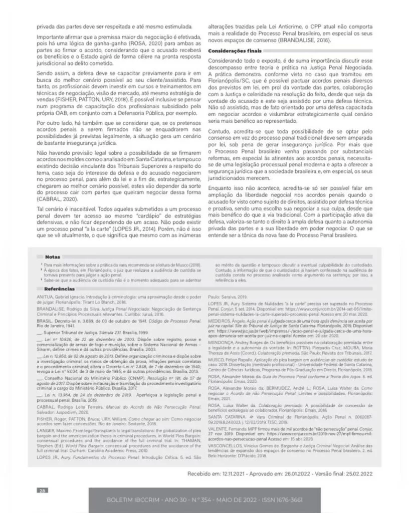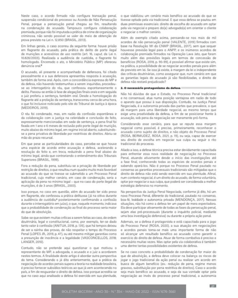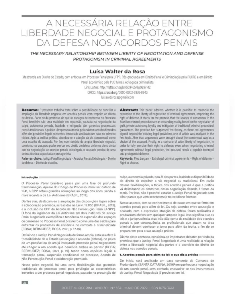 Íntegra do artigo disponível aqui: https://www.academia.edu/82079970/A_necess%C3%A1ria_rela%C3%A7%C3%A3o_entre_liberdade_negocial_e_protagonismo_da_defesa_nos_acordos_penais