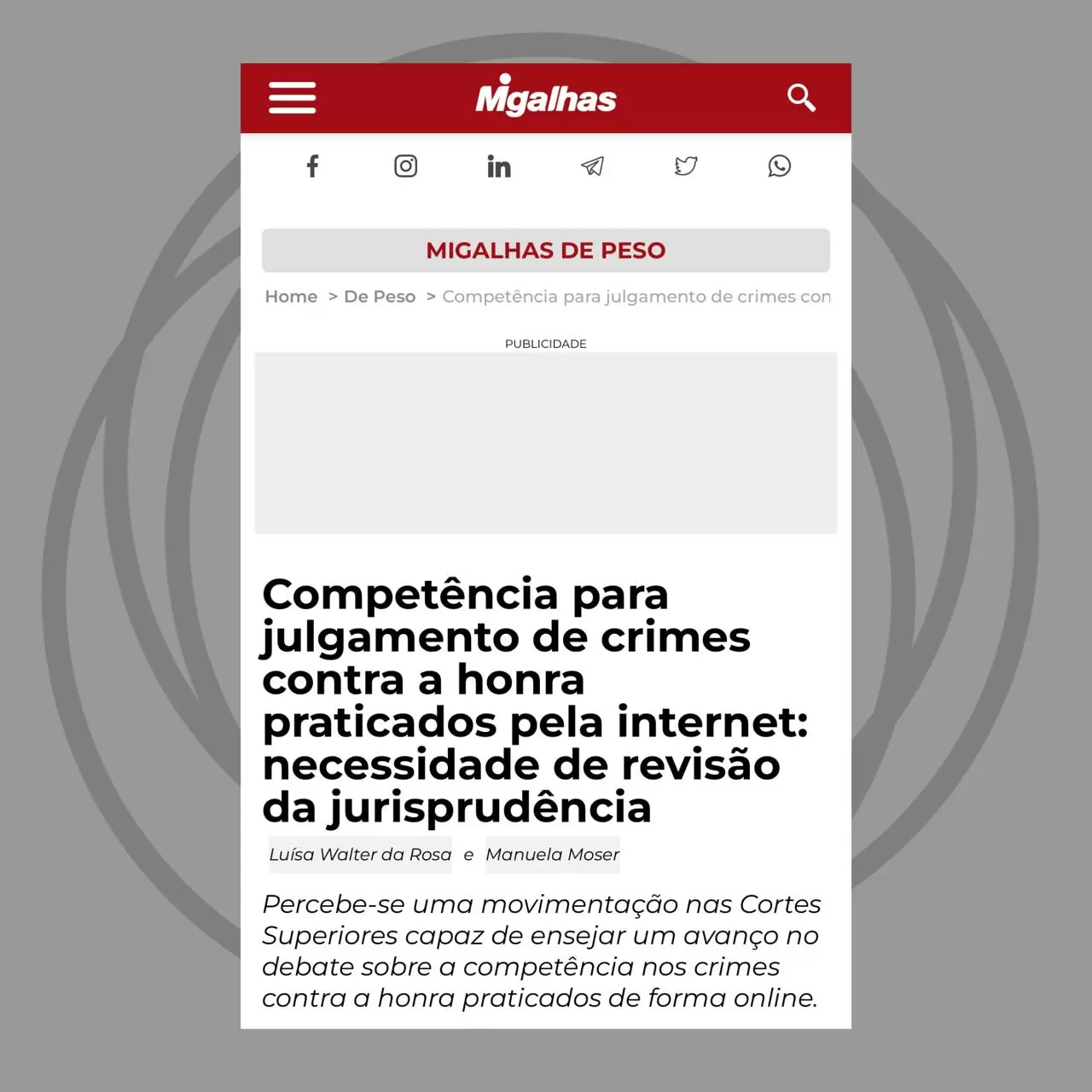 Artigo originalmente publicado em: https://www.migalhas.com.br/depeso/372837/competencia-para-julgamento-de-crimes-contra-a-honra-na-internet
