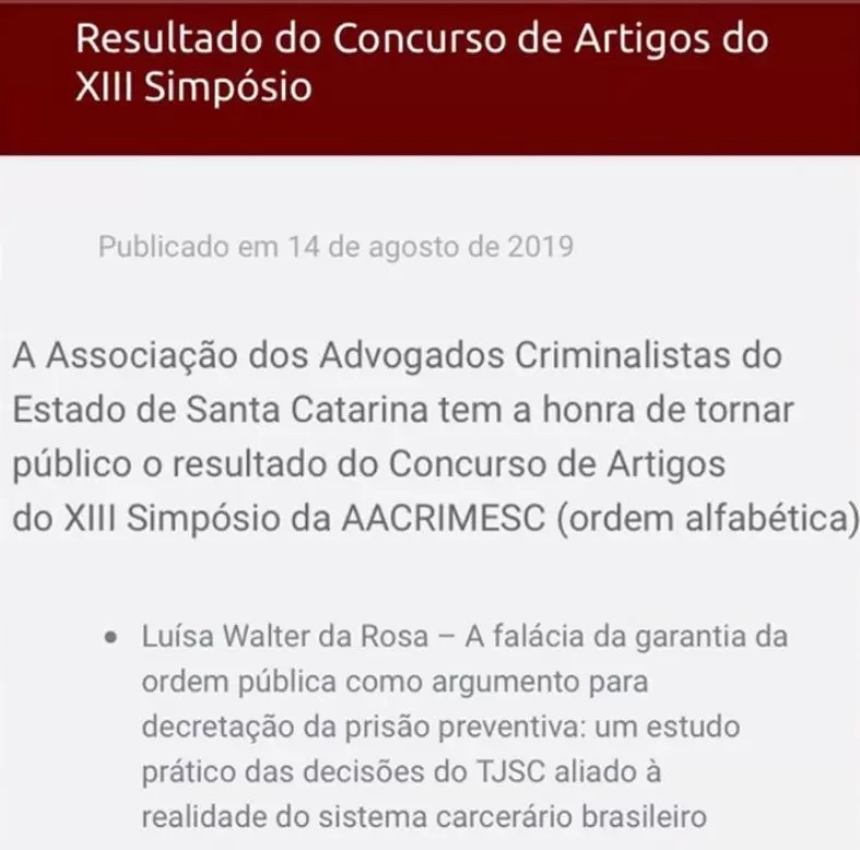 A advogada Luísa Walter da Rosa teve seu artigo científico aprovado para publicação como capítulo de livro, fruto do XIII Simpósio da Associação dos Advogados Criminalistas do Estado de Santa Catarina.