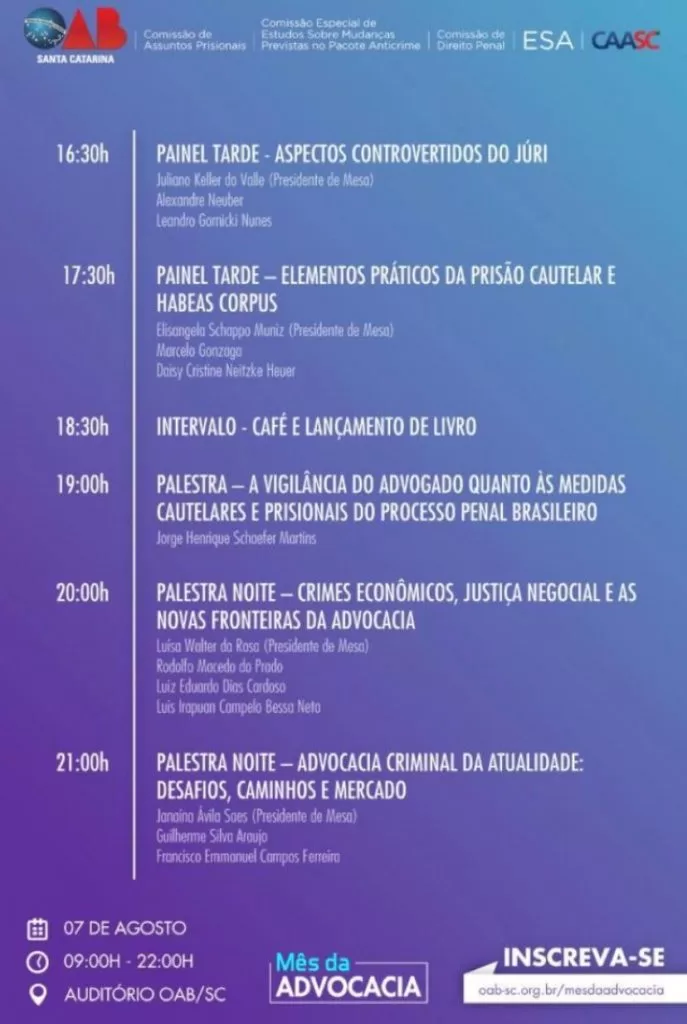 No dia 07 de agosto de 2019, a advocacia criminal catarinense se reuniu, na sede da OAB/SC, para realizar uma série de debates sobre temas atinentes à classe.