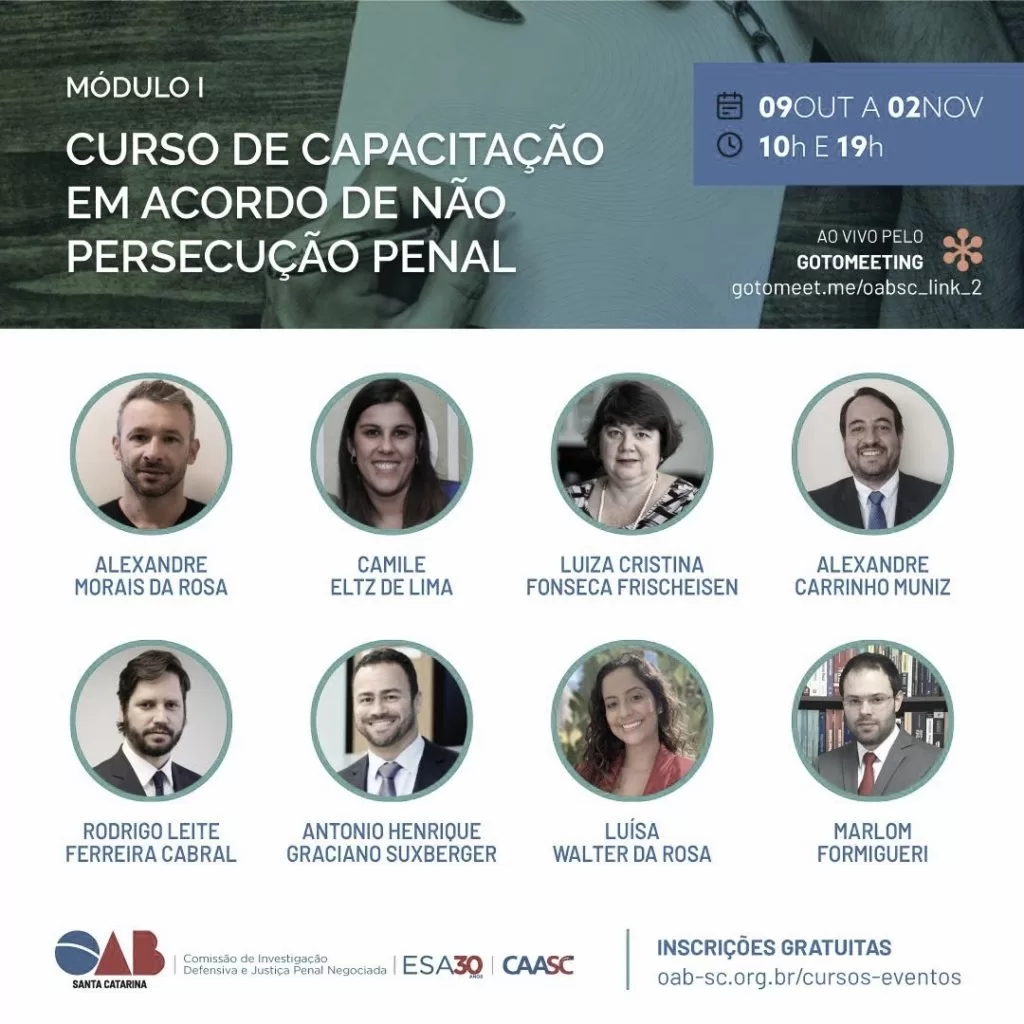 A Comissão de Investigação Defensiva e Justiça Penal Negociada (@cidjupen) da OAB/SC promoveu, em outubro e novembro de 2020, o primeiro módulo do Curso de Capacitação em Acordo de Não Persecução Penal (ANPP).