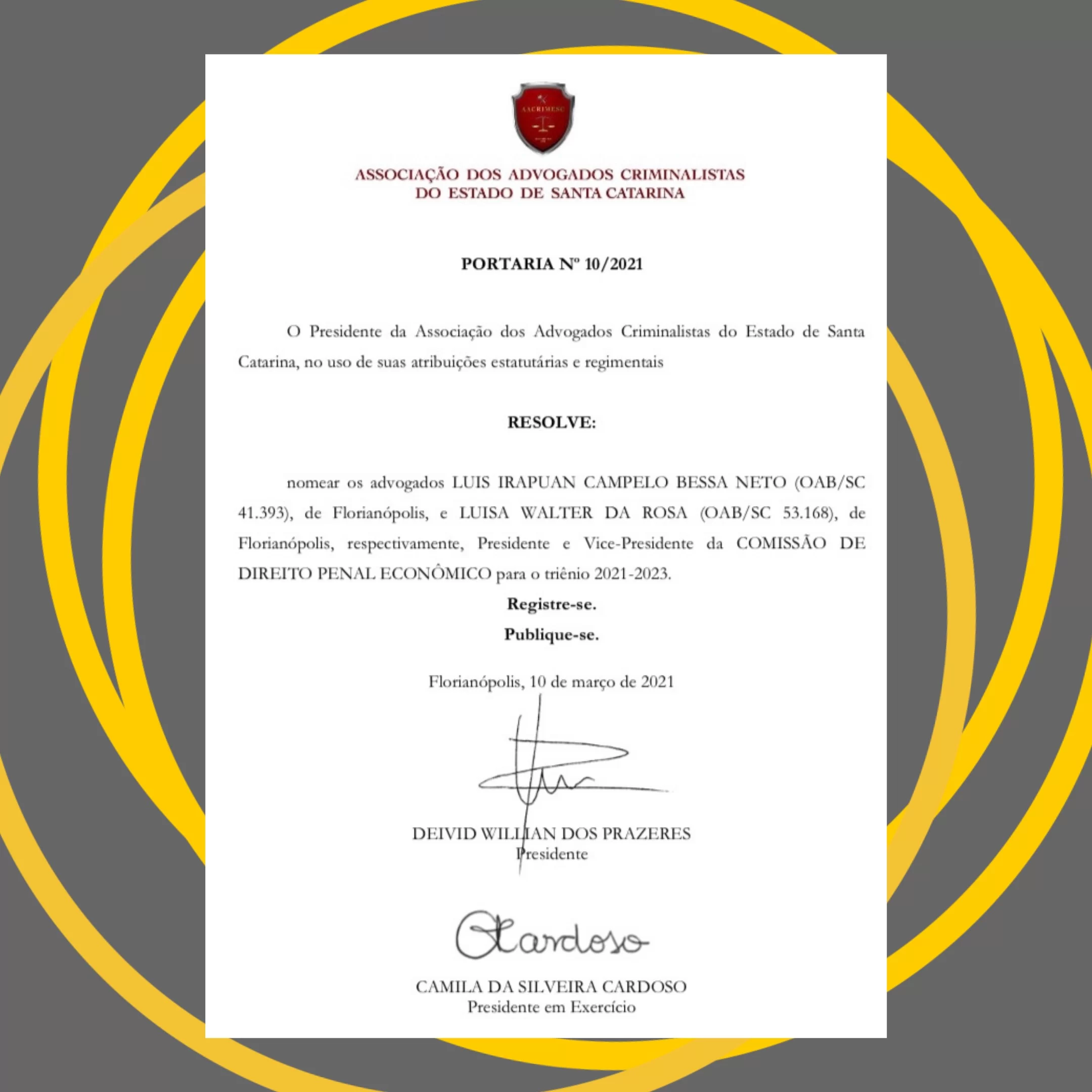 A partir de março de 2021, a advogada Luísa Walter da Rosa assumiu, ao lado do Dr. Luis Bessa Neto, a coordenadoria da recém criada Comissão de Direito Penal Econômico da Associação dos Advogados Criminalistas do Estado de Santa Catarina (AACRIMESC).